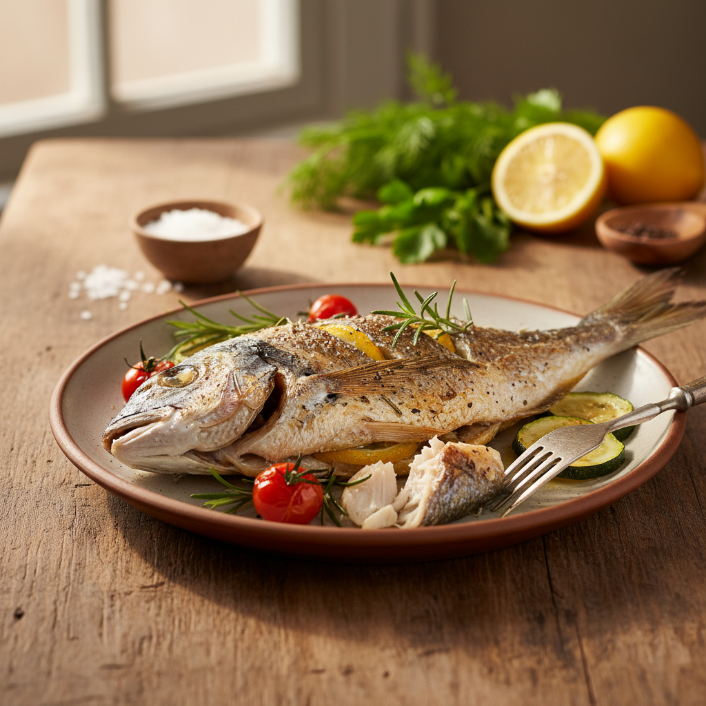 - Dorada irjūros ešerys: Šios žuvys dažniausiai kepamos visos (su galva ir uodega). Jų oda puikiai sulaiko drėgmę viduje, o kaulai suteikia papildomo skonio.